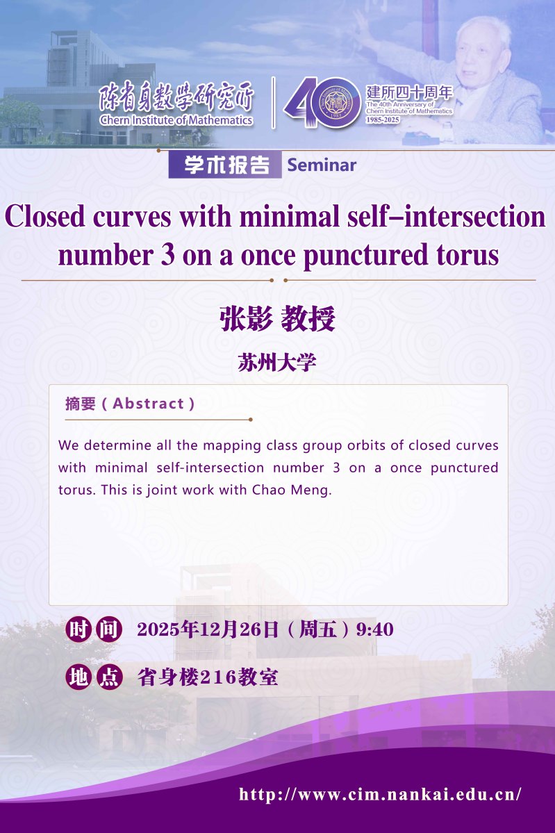【学术报告】张影 教授:Closed curves with minimal self-intersection number 3 on a once punctured torus